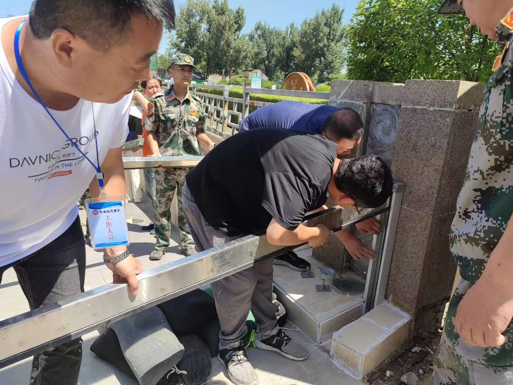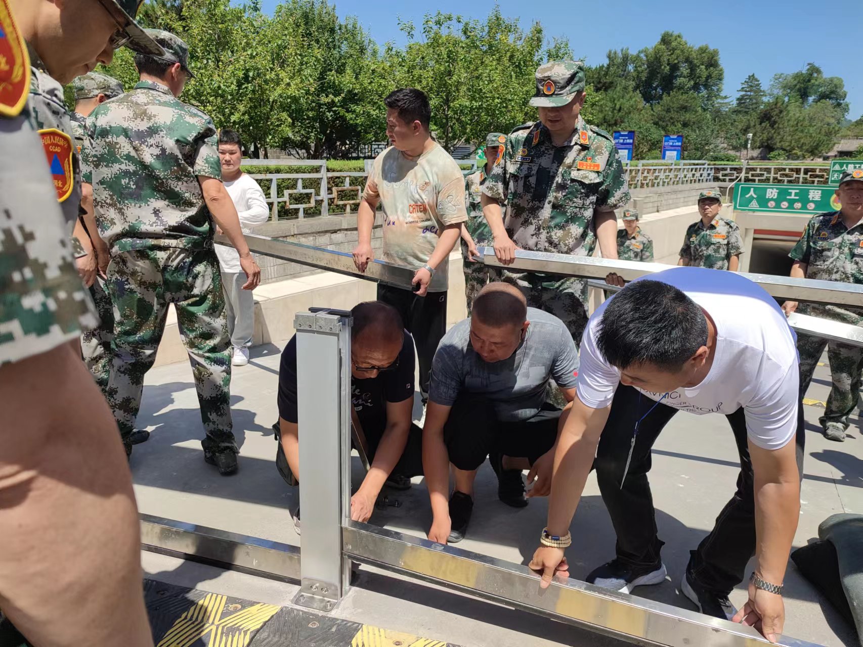 两宫门地下停车场因地势较低汛期的最大隐患就是雨水倒灌,这次防汛演练是一次实战演练,用时5分钟就完成了一处停车场入口的演练内容,做到挡板安装完毕两端螺销固定不松动,挡板中部钢结构支护不滑动,防汛沙袋堆堵密实。