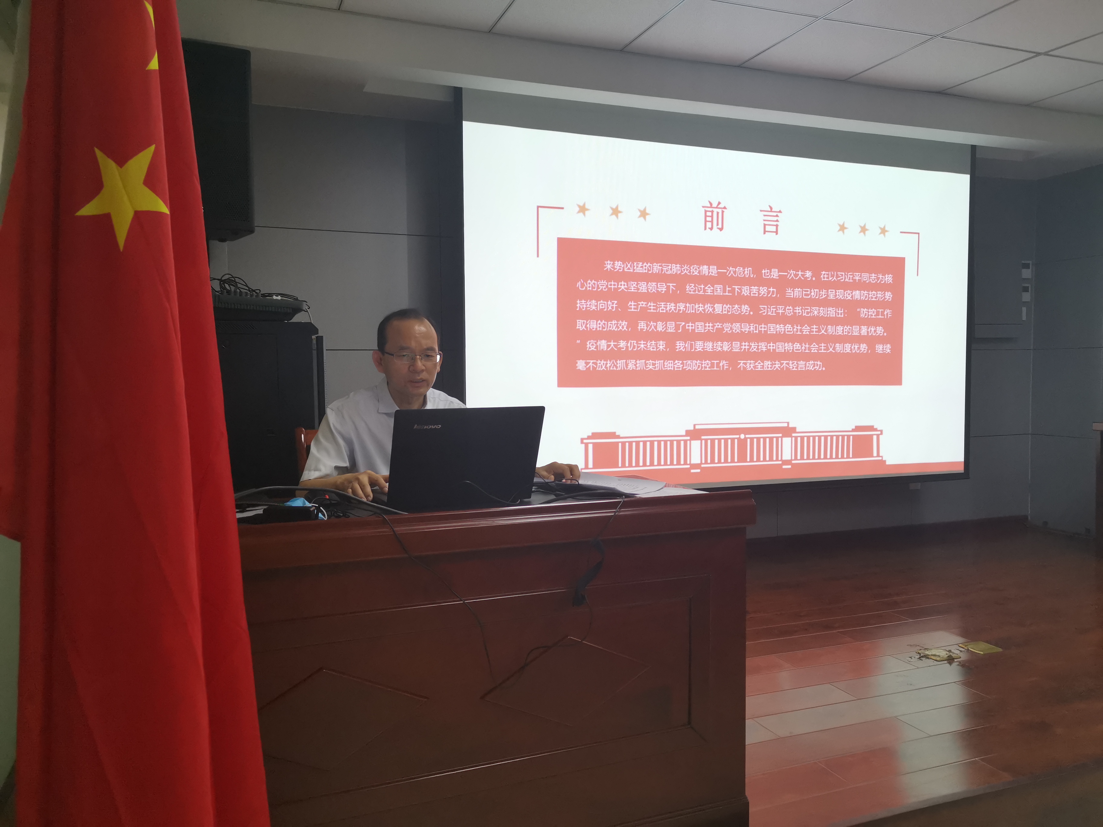 2020年7月2日上午,中共乐动平台第二支部委员会支部书记焦俊良同志以“在大考中彰显中国特色社会主义制度优势”为题,为全体支部党员和入党积极分子上了一堂别开生面的党课。