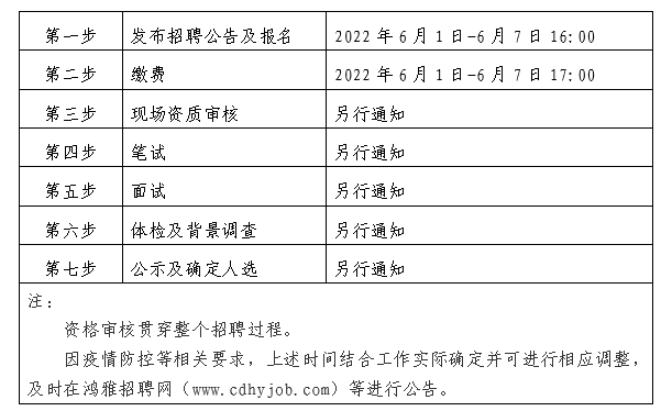 2022年6月1日至2022年6月7日16:00 在鸿雅招聘网(http://www.cdhyjob.com/)、鸿雅微信公众号、乐动平台官方网站(/)及上级部门要求的相关网站等发布招聘公告。