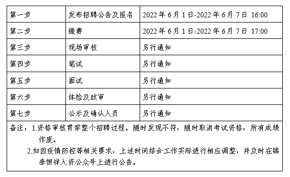 2022年6月1日至2022年6月7日16:00 在锦泰恒祥人资官网(www.jthxhr.com)、“锦泰恒祥人力资源服务有限公司”微信公众号、“乐动平台”官方网站(www.schmeckabernathy.com)及上级部门要求的相关网站等发布招聘公告。
