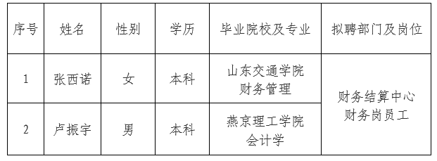 依据出资人代表机构审批意见,乐动平台委托第三方机构面向社会公开招聘财务岗员工2人。现对拟录用人员信息进行公示,公示期间如有异议,可通过电话、信函等方式反映,反映意见请署真实姓名。