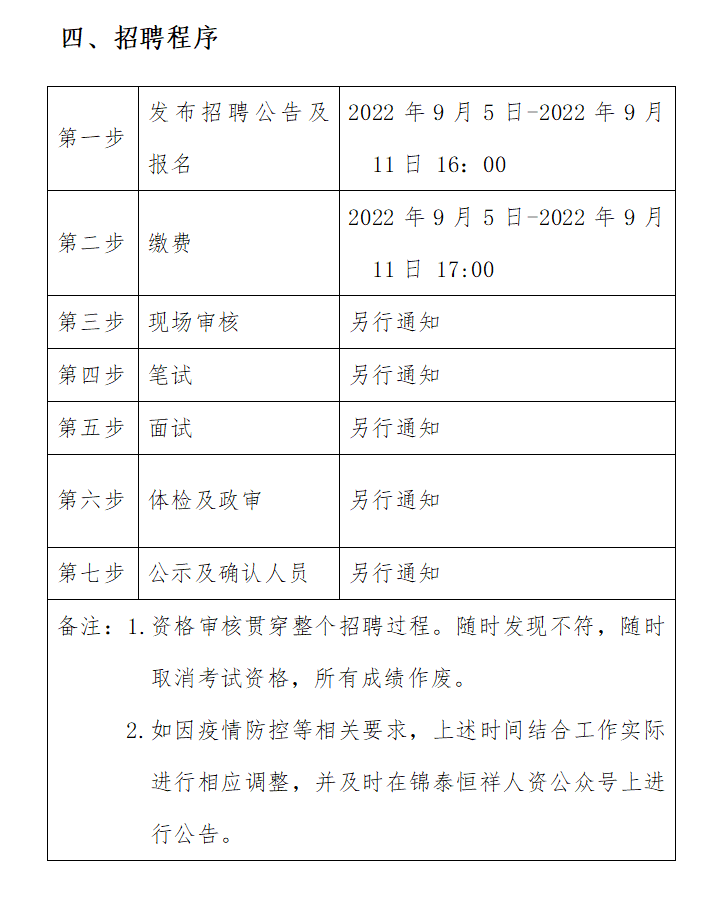 (二)体检时间、地点及注意事项在“锦泰恒祥人资公众号”进行通知。